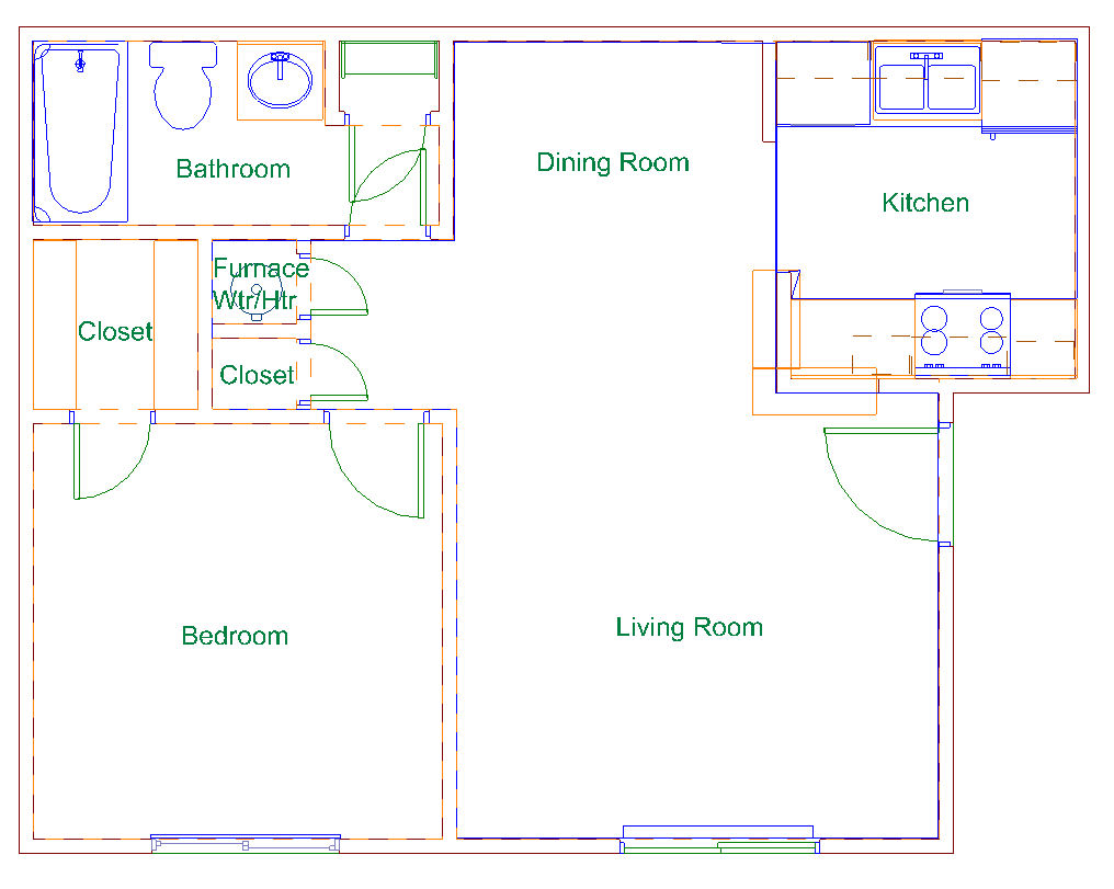 These are rendered drawings of a one bedroom with fireplace @ Sugar Creek Click on any photo for a larger view. The colors shown in the renderings are not completely accurate, most of the apartments are painted a white or off white color. The furnishings including tvs, pictures and furniture are not included. They are shown here to better help you visualize what it will look like when you get moved in.